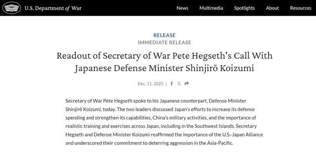 当地时间12月12日,日本防卫大臣小泉进次郎与美国国防部长赫格塞思举行通话。按照日本防卫省发布的消息,在通话中,双方讨论了中方雷达照射日本F-15战机的事情,并“一致认为该行为加剧地区紧张”。