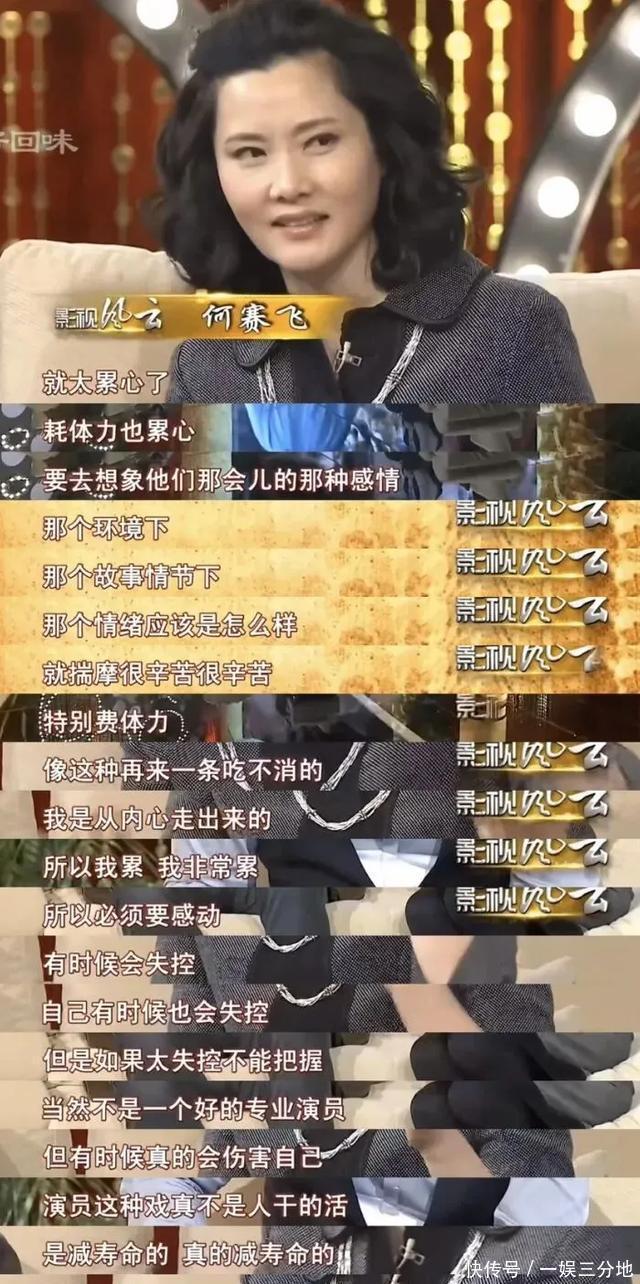 《风月》中的郁秀仪 她与前来投奔的弟弟产生了畸形的依恋。在一场对手戏中,入戏太深的何赛飞情绪失控,现场胃痉挛,疼得不行。 这种“灵魂附体”般的演戏方式,让何赛飞多次感慨,做演员太累心了,要折寿的,这是生命的折旧。