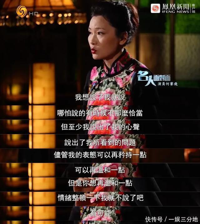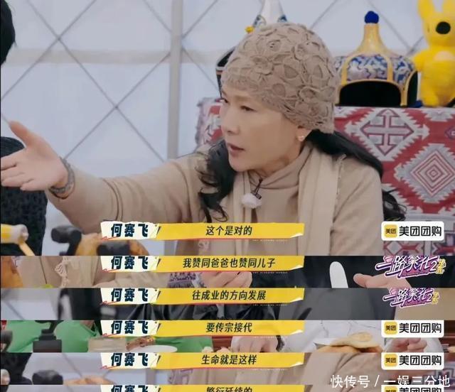 这番发言,在当下传统到有些古板的发言,但网友的审判和批评还没开始,就熄火了。因为大家发现,何赛飞的孩子随母姓,她所谓的传宗接代,是传自己的宗,接女性的代。 不仅如此,何赛飞还有着老派专一的感情观,年轻时的她直言曾在得知丈夫有过情史时,对他大倒胃口。 结婚后,她因戏约不断,丁克十年。孩子出生后的几年,也是丈夫承担起了大部分的育儿工作。 何赛飞在后采中解释自己支持传宗接代的本意没有性别之分 封建意义上的“传宗接代”,全然不存在于何赛飞的人生中。网友们的态度顿时180度反转,他们将何赛飞称为“传统激进派”,认为她只不过是用魔法打败魔法,“走男人的路,让男人无路可走”。 看节目的观众们一方面为她的大胆发言捏一把汗,同时又欣赏于这份不立人设、不迎合主流观点的真实。 这在害怕出错的内娱,尤为难得。 但何赛飞一向如此,几十年如一。 真性情 《一路繁花2》之前,何赛飞的出圈片段之一,是斩获金鸡影后时的微醺发言。 两年前,60岁的她凭借《追月》,击败惠英红、闫妮、殷桃等人,斩获最佳女主角。 她在台上又哭又笑,刚冷静下来羞涩地说“哎呀不好意思,我年龄大了还这样”,随后又抑制不住地笑出声来。一段絮絮叨叨的发言,打破了颁奖典礼大气庄严的氛围,令台下众多明星忍俊不禁。 在喜出望外的人生时刻,情绪难免不受控。但事实上,何赛飞向来就是个藏不住自己的人。 接受采访时,她坦言自己常常“嘴上没个把门儿”,总是把自己心中所想悉数吐露,和盘托出。 张艺谋邀请何赛飞出演《大红灯笼高高挂》时,已闻名国际。彼时何赛飞虽然是越剧名伶,但在影视界不过是个新人。 即便如此,她也一点不轻视自己,“叫我跑龙套我就不去,管你是什么导演”。